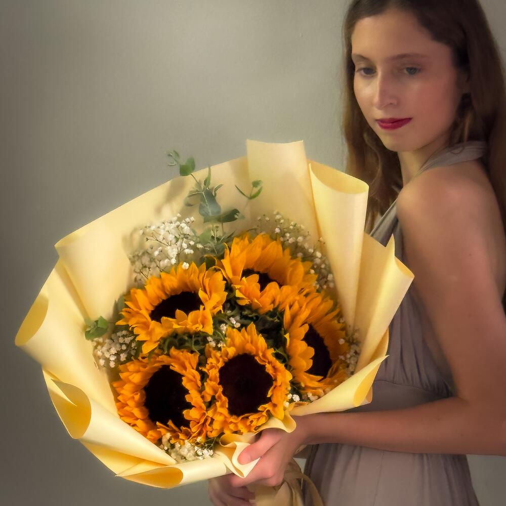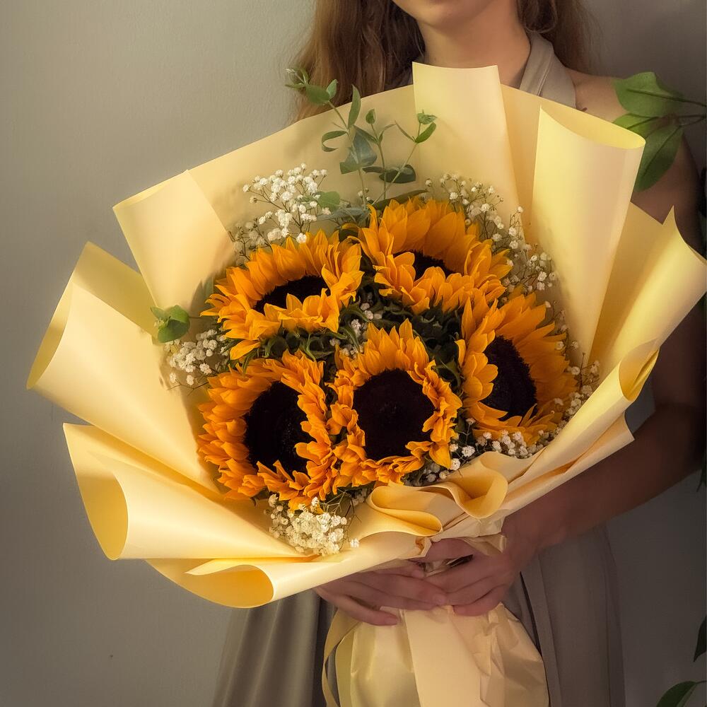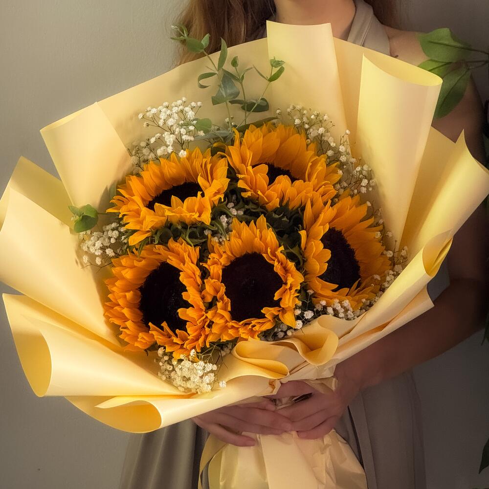 Яркий, смелый и полный радости, этот вдохновляющий букет состоит из 5 сияющих подсолнухов, красиво обернутых теплыми золотистыми тонами и дополненных нежной гипсофилой и свежей зеленью. Каждый подсолнух выбран за свой насыщенный цвет и жизнерадостный вид, создавая мгновенно поднимающий настроение подарок. Идеально подходит для дней рождения, поздравлений, слов благодарности, пожеланий выздоровления или просто для того, чтобы заставить кого-то улыбнуться. Этот букет дарит счастье с момента доставки. Простой, яркий и незабываемый — это цветочное напоминание о том, что солнечным светом можно поделиться в любой день. Подарите мгновенное солнышко сегодня — места на доставку в тот же день быстро заполняются.
