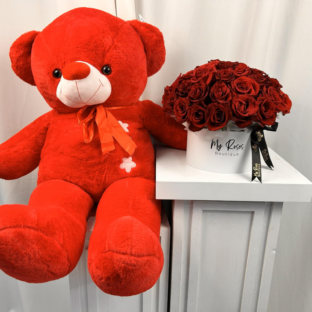 50 красных в белой коробке с красным плюшевым мишкой 100 см