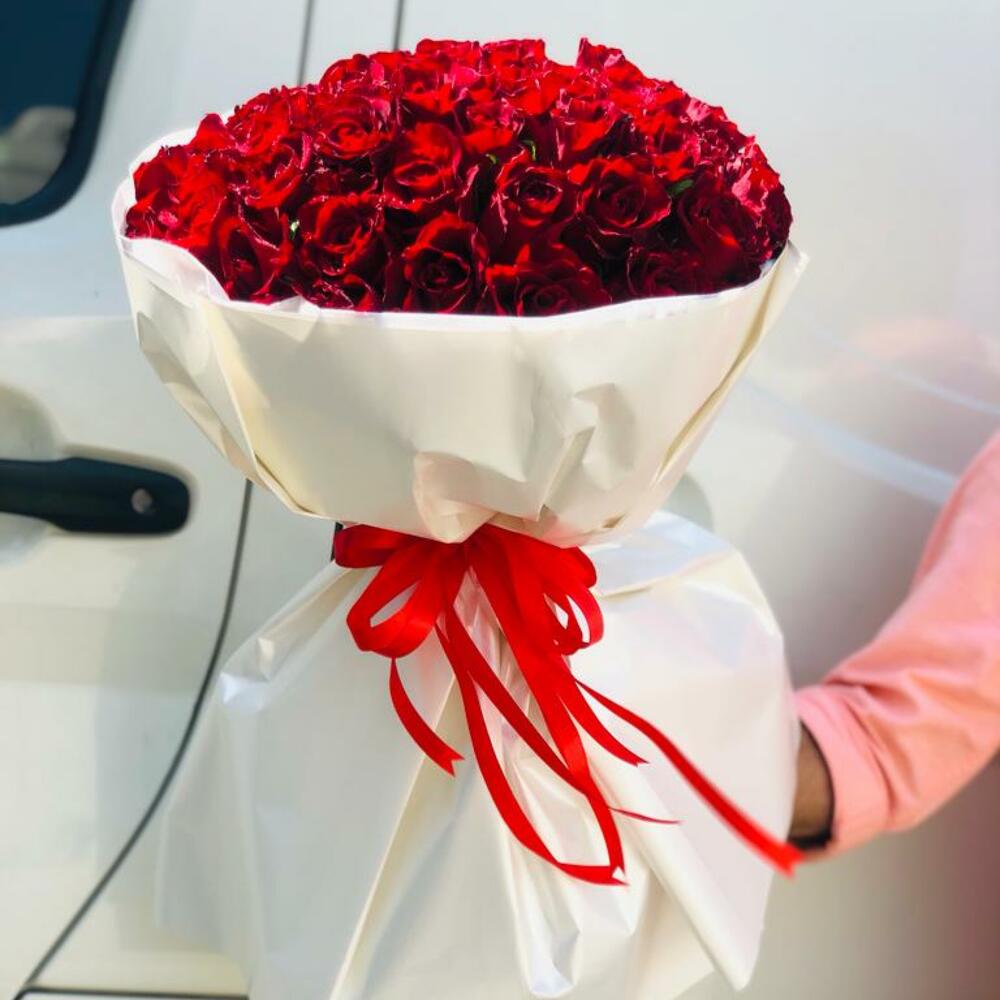 50 красных роз, завернутых в белую оберточную бумагу для букета с красной лентой.