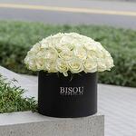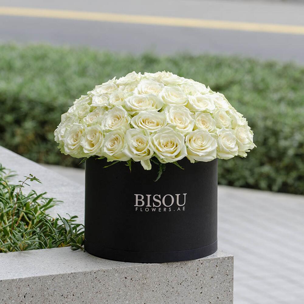 Композиция из 50 стеблей белых роз в черной коробке