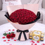 Описание - Прекрасный, трогающий сердце букет из 51 красной розы в чёрно-розовой обёртке в форме сердца, перевязанный чёрной лентой с бантом, коробка шоколадных конфет Ferro Rocher 16 шт.