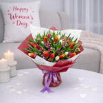 Описание - Красивый букет из 51 тюльпана — красных, фиолетовых и белых — с розовыми восковыми цветами в красной мраморной упаковке и белой упаковке с дизайном в виде сердца, перевязанный фиолетовым бантом.