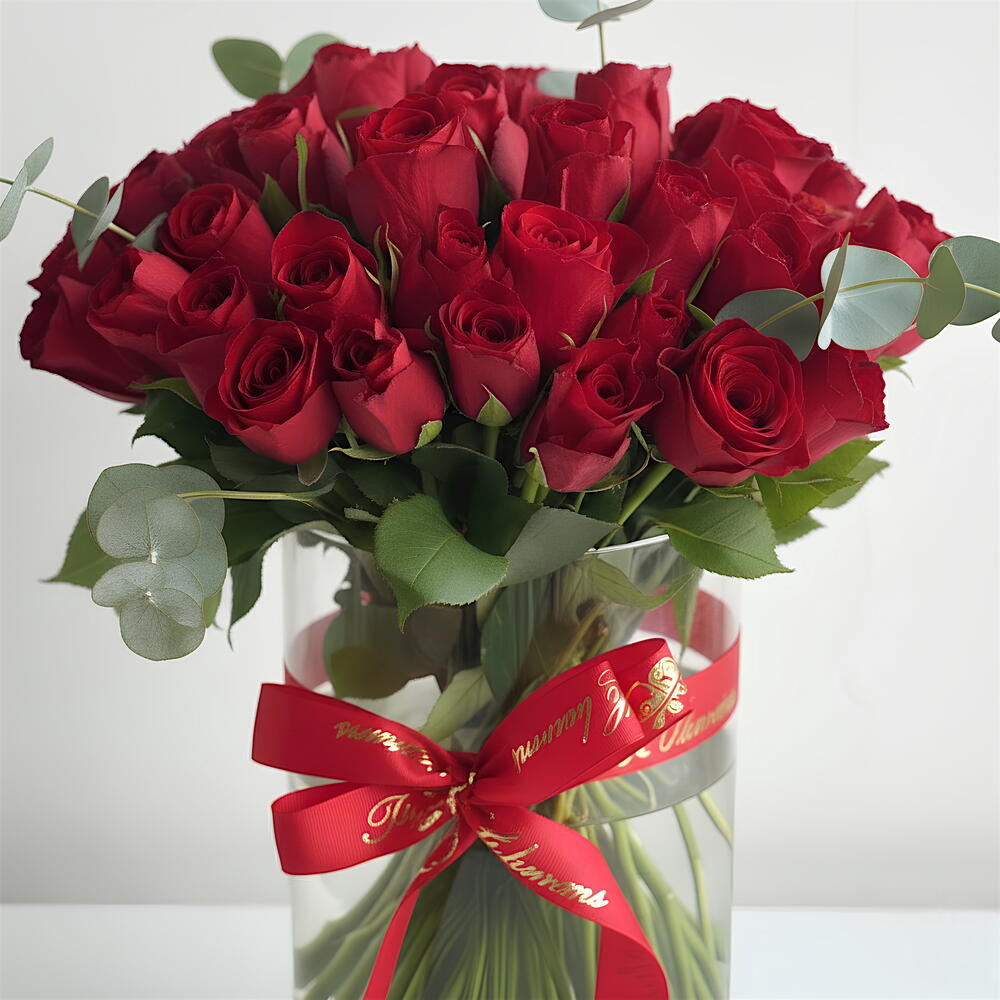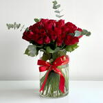 Red rose - 51 шт. Ribbon - 1 шт. glass vase - 1 шт.