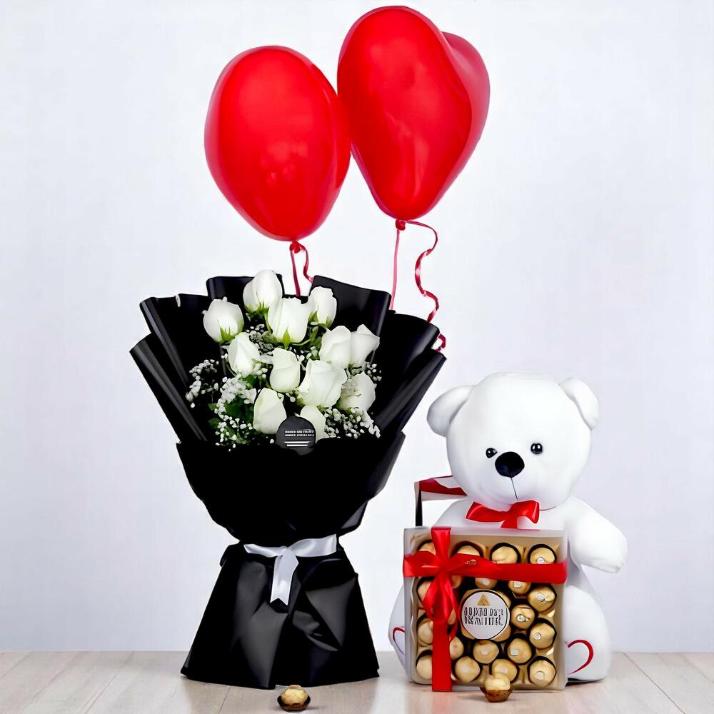 White rose - 51 шт. Teddy bear - 1 шт. message card - 1 шт. упаковка шоколадных конфет ferrero rocher - 1 шт. красные гелиевые шары в форме сердца - 2 шт.