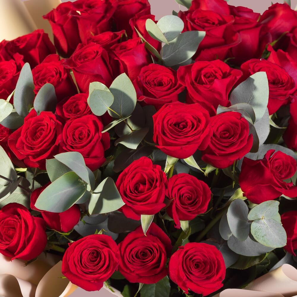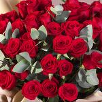 Red rose - 51 шт. Eucalyptus - 13 шт. Wrapping - 1 шт.