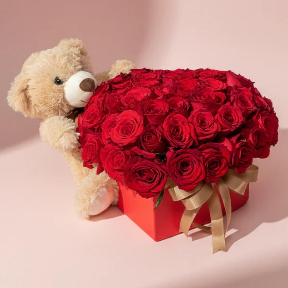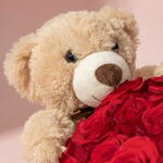 Red rose - 51 шт. Teddy bear - 1 шт.