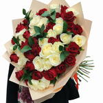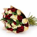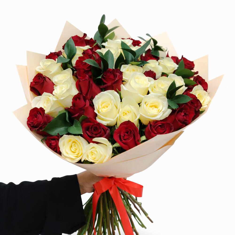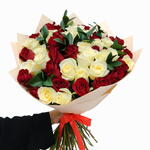 Red rose - 26 шт. White rose - 25 шт. wrapping paper - 5 шт. одна ветка рускуса - 7 шт.