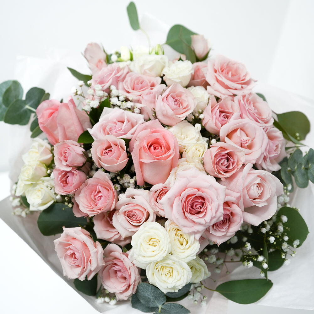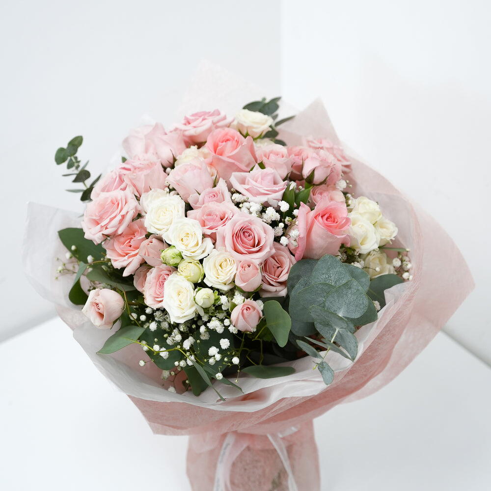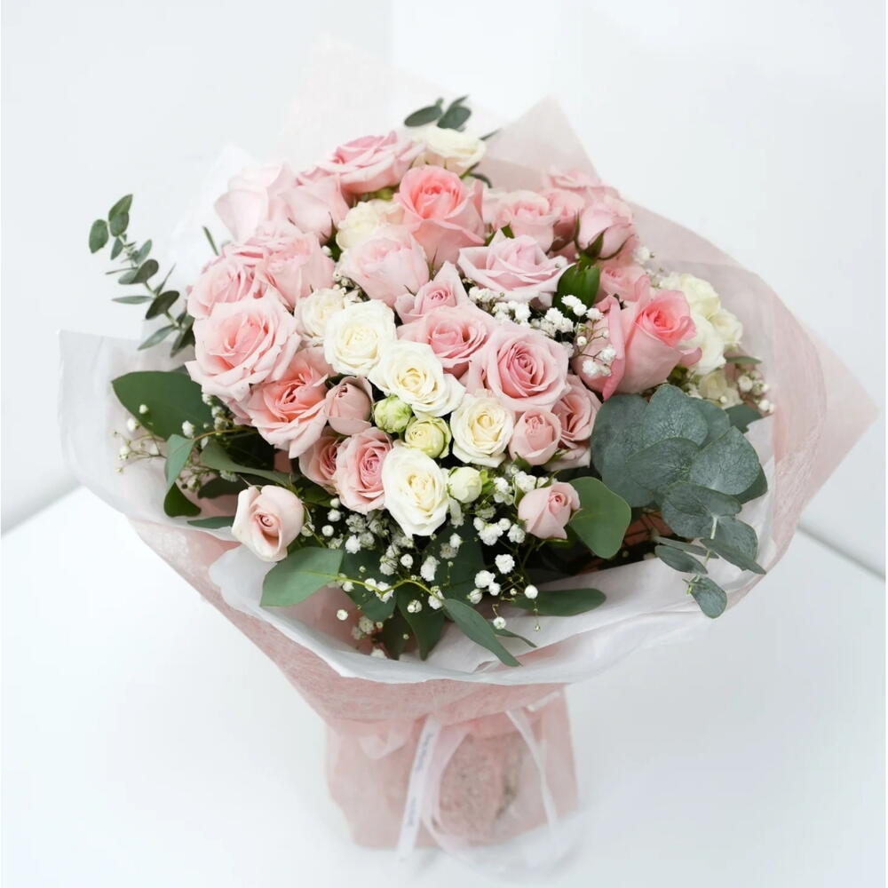 Pink rose - 20 шт. eucalyptus leaves - 5 шт. розовые спрей-розы - 11 шт. белые спрей-розы - 21 шт. гипсофила - 5 шт.
