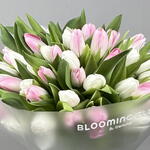 Пятьдесят один тюльпан смешанного белого и розового цвета создают потрясающую композицию, их нежные оттенки символизируют баланс любви и восхищения. Этот букет выглядит роскошно и элегантно, идеально подходит для свадеб, юбилеев или как грандиозный жест любви.
