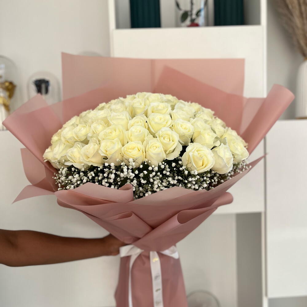 Насладитесь чистотой и элегантностью простоты с нашим изысканным букетом из 51 свежей белой розы в элегантной упаковке.