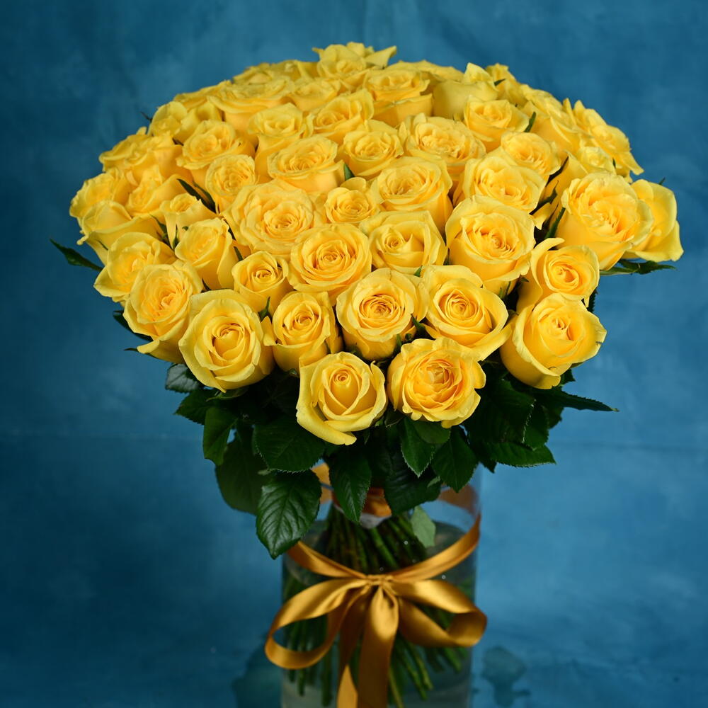 Yellow rose - 51 шт. ribbon satin - 1 шт. цилиндрическая ваза - 1 шт.