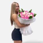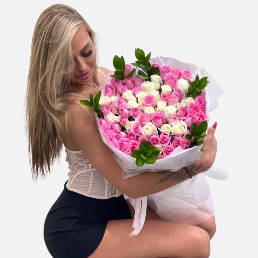 Великолепная композиция из 41 розы, включающая нежный микс розовых и белых цветов (21 белая и 20 розовых), искусно упакованная в элегантную белую бумагу. Букет дополнен шестью веточками пышной зелёной листвы, которые придают букету нотку свежести и контраста. Идеально подходит для выражения любви, признательности или торжества.