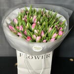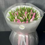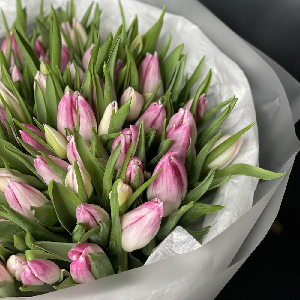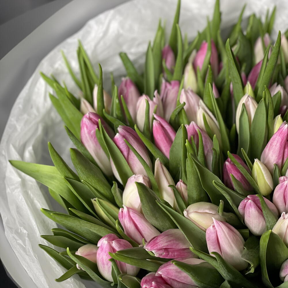 Прекрасный букет из 75 свежих смешанных розовых тюльпанов, тщательно составленный и элегантно упакованный, создающий мягкий и очаровательный цветочный подарок🌷