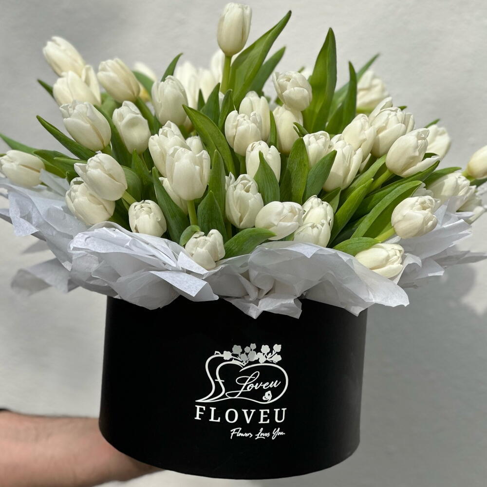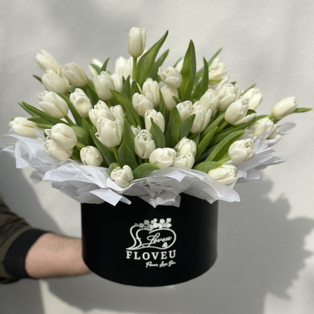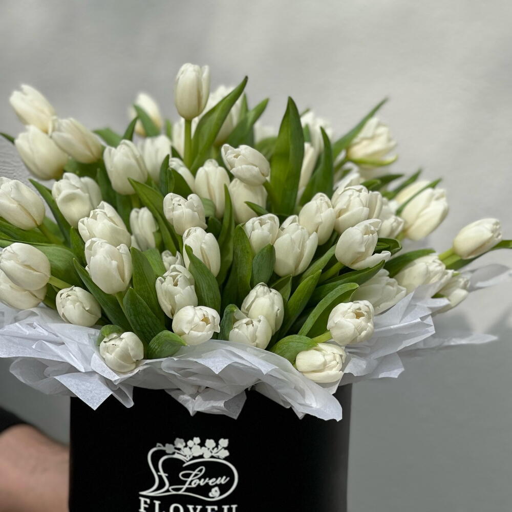 70 белых тюльпанов в коробке