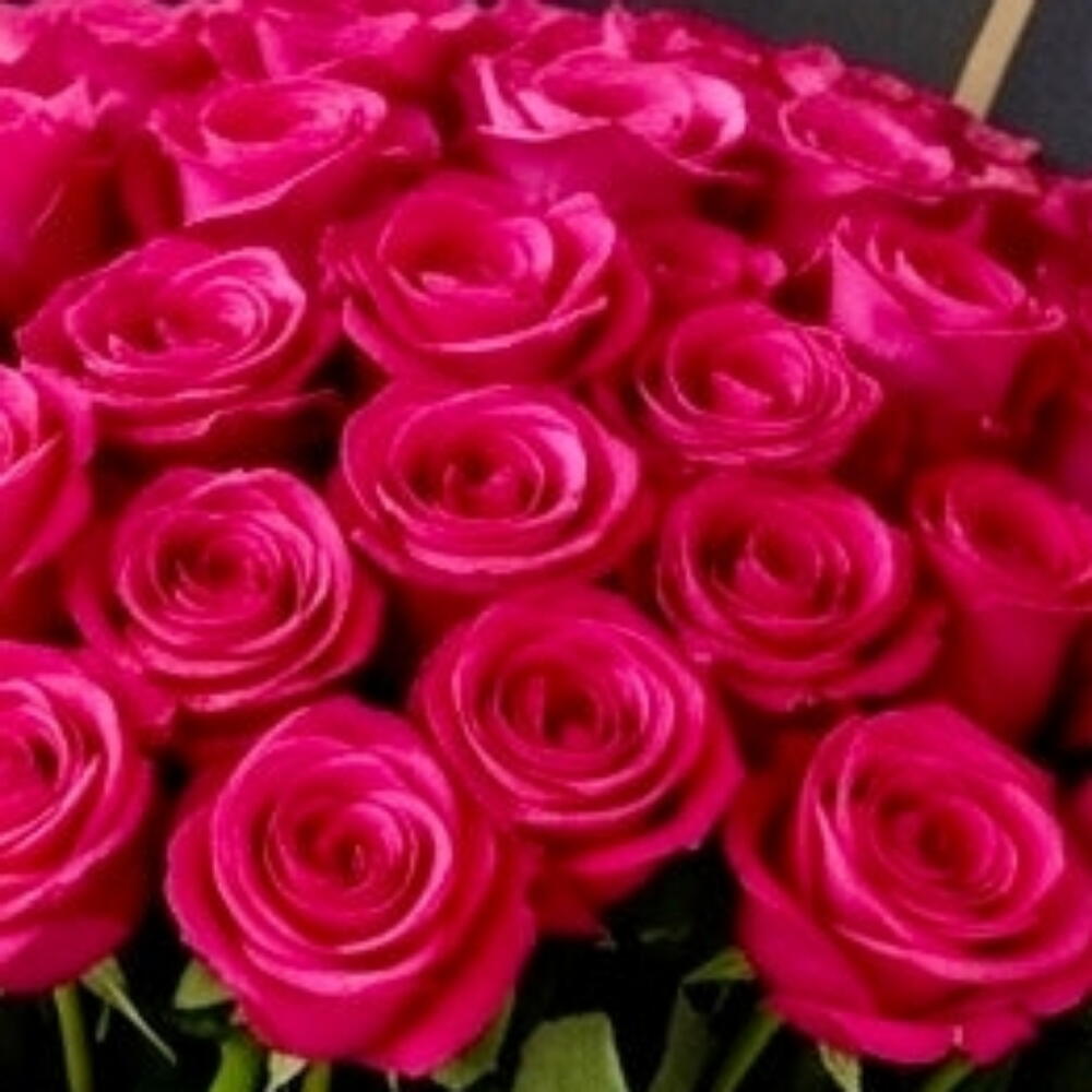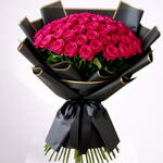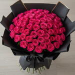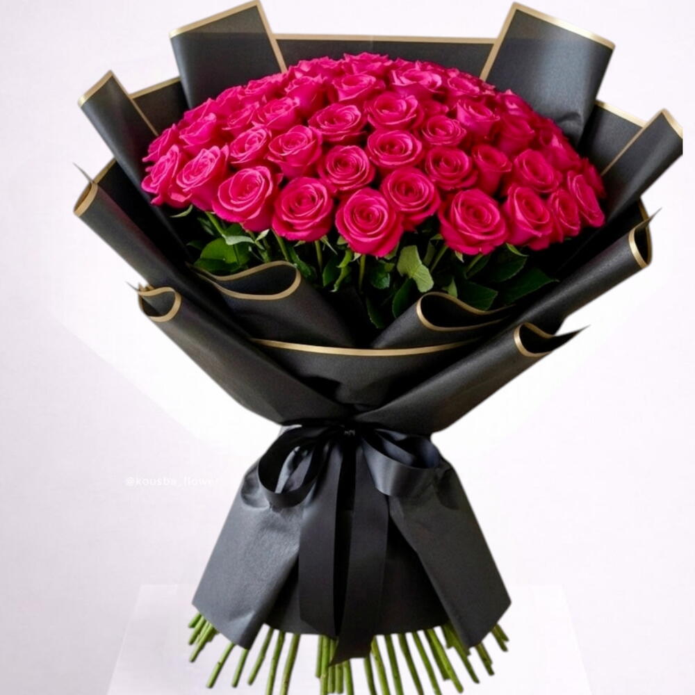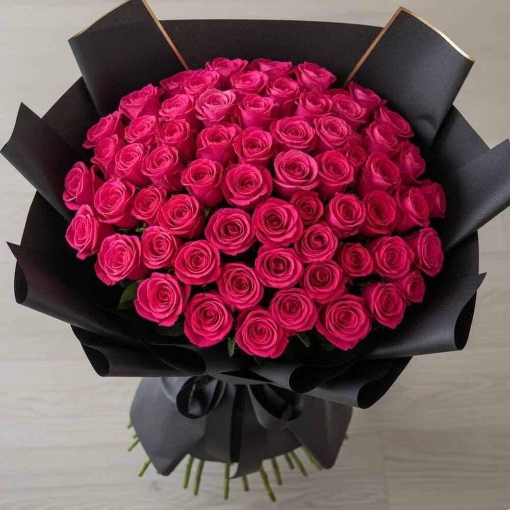 Большой роскошный букет, состоящий из множества ярко-розовых роз, часто ассоциируемых с любовью, страстью и романтикой. Розы уложены в плотную округлую форму. Вся композиция элегантно завернута в чёрную бумагу и закреплена у основания широкой чёрной лентой, завязанной бантом.