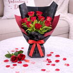 Дес - Прекрасный, трогательный букет из 9 красных роз, украшенный композицией "Песнь Индии" в черно-красной обертке в форме сердца, перевязанной красной лентой.