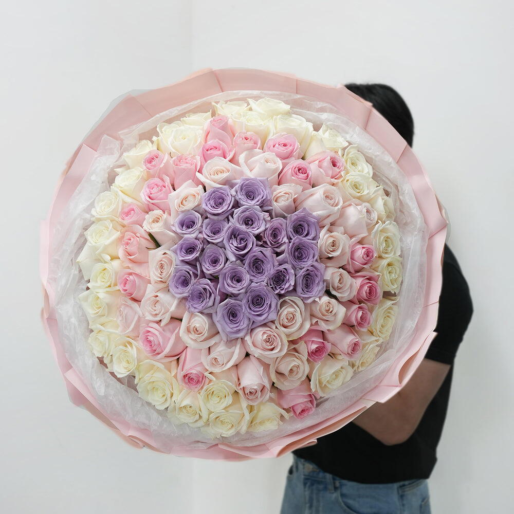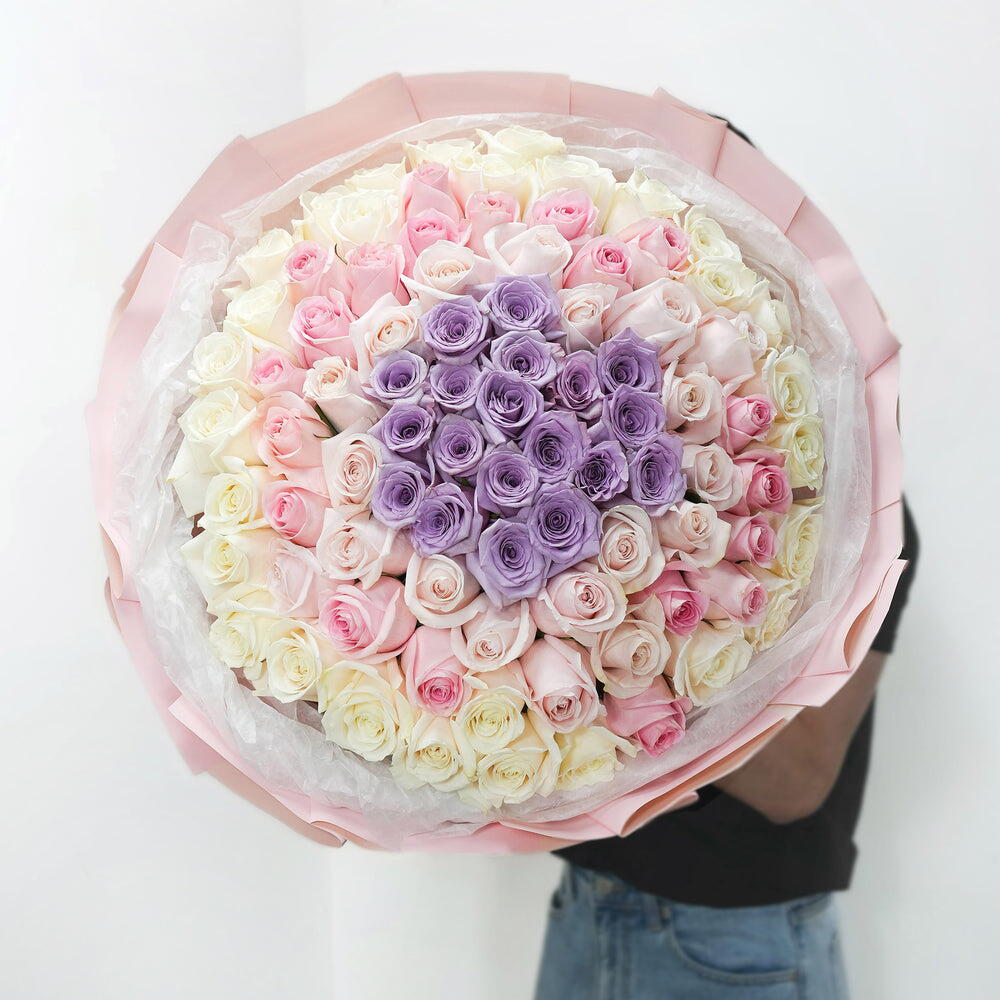 Насладитесь изысканным очарованием нашего моно-букета, идеальной гармонией элегантных кремово-белых роз с сорока восхитительными бутонами. В сочетании с деликатной притягательностью двадцати нежно-розовых роз и аналогичного количества персиковых роз эта композиция излучает ауру утончённости и нежности. Девятнадцать фиолетовых роз добавляют нотку загадочности и глубины, делая этот букет неотразимой симфонией цветов и ароматов, гарантированно очаровывающей каждого эстетического ценителя.