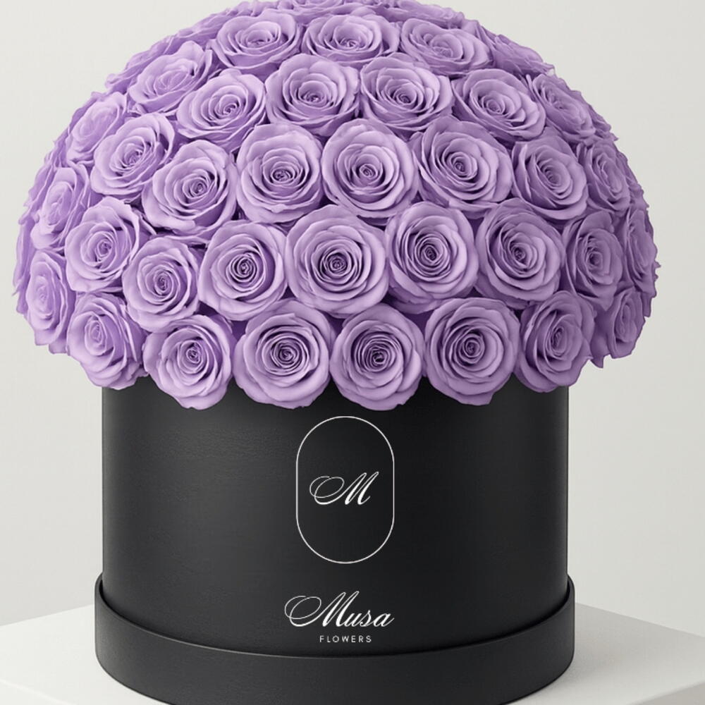 Подарок, который очаровывает глаза и сердце: шляпная коробка с фиолетовыми розами — воплощение изящества и таинственности. Заключённая в изысканную чёрную коробку, композиция источает весь свой шарм, превращая любой повод в незабываемый момент.