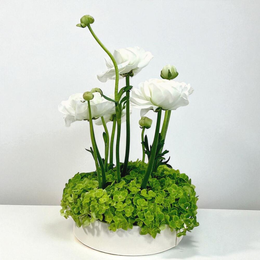 Эта современная композиция из белых ранункулюсов — истинное воплощение чистоты и элегантности. Нежные белые цветы грациозно возвышаются над пышной зелёной основой, создавая свежую и минималистичную композицию. Идеально подходит для того, чтобы освежить любой интерьер, она приносит чувство спокойствия и гармонии в пространство. Отличный подарок на дни рождения, годовщины, свадьбы, новоселья или как внимательный жест сочувствия и поддержки. Чтобы сохранить композицию свежей, поместите её в прохладное место и ежедневно слегка опрыскивайте цветы. Её чистый и вневременной дизайн делает её универсальным выбором как для праздничных, так и для камерных торжеств.
