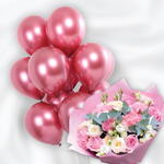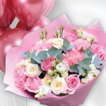 Pink rose - 5 шт. pink carnations - 5 шт. стебли белого лизиантуса - 5 шт. листья эвкалипта - 2 шт. white roses - 5 шт. воздушные шары цвета розового золота - 11 шт.