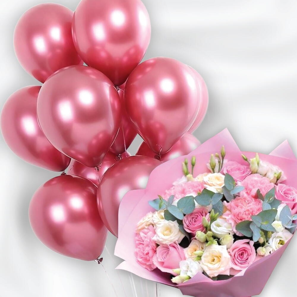 Pink rose - 5 шт. pink carnations - 5 шт. стебли белого лизиантуса - 5 шт. листья эвкалипта - 2 шт. white roses - 5 шт. воздушные шары цвета розового золота - 11 шт.