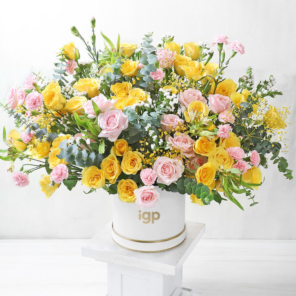Цветочная композиция из жёлтых роз, роз сорта «сладкий аваланж», зелёных альстромерий, розовых кустовых гвоздик, белой статицы, жёлтого гипсофилла и эвкалипта, помещённая в изящную белую коробку, олицетворяет изящество. Идеальное дополнение к интерьеру, которое украсит ваш дом.
