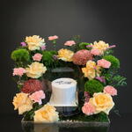 Акриловый поднос с мини-тортом и цветочными композициями