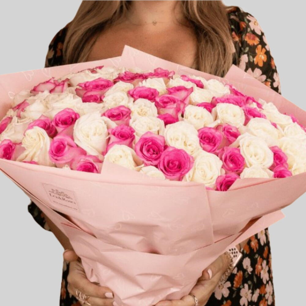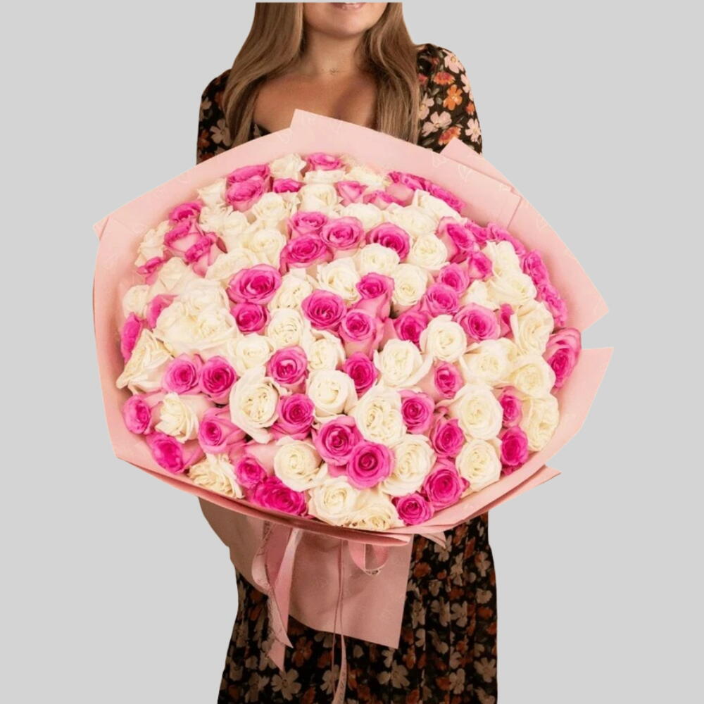 Букет — гармоничный символ любви, уважения и восхищения, что делает его отличным выбором для различных случаев. Будь то празднование важной вехи, благодарность или выражение самых глубоких чувств, эта композиция говорит сама за себя своим изысканным дизайном и продуманным сочетанием цветов.