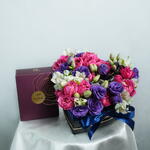 Eustoma - 4 шт. Alstroemeria - 3 шт. вишнёвый - 5 шт. чёрная коробка в форме сердца - 1 шт. парфюм ahmed al maghribi oud roses 60 мл - 1 шт.