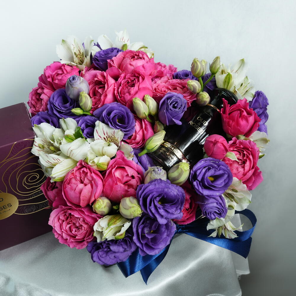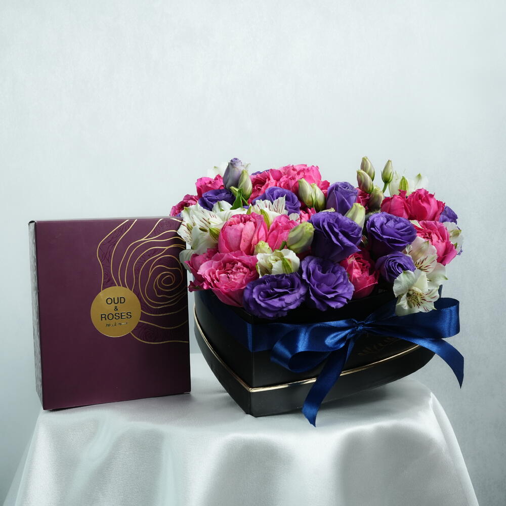 Eustoma - 4 шт. Alstroemeria - 3 шт. вишнёвый - 5 шт. чёрная коробка в форме сердца - 1 шт. парфюм ahmed al maghribi oud roses 60 мл - 1 шт.