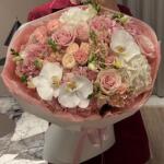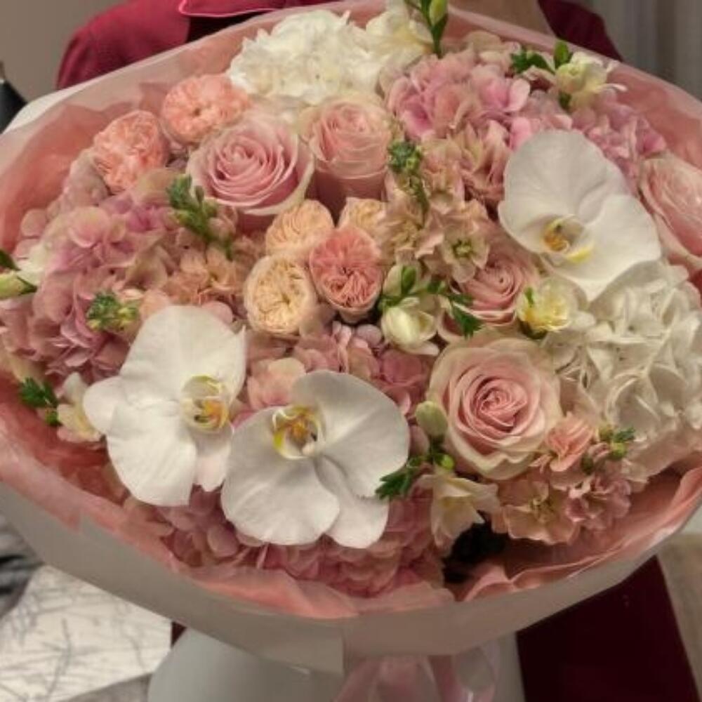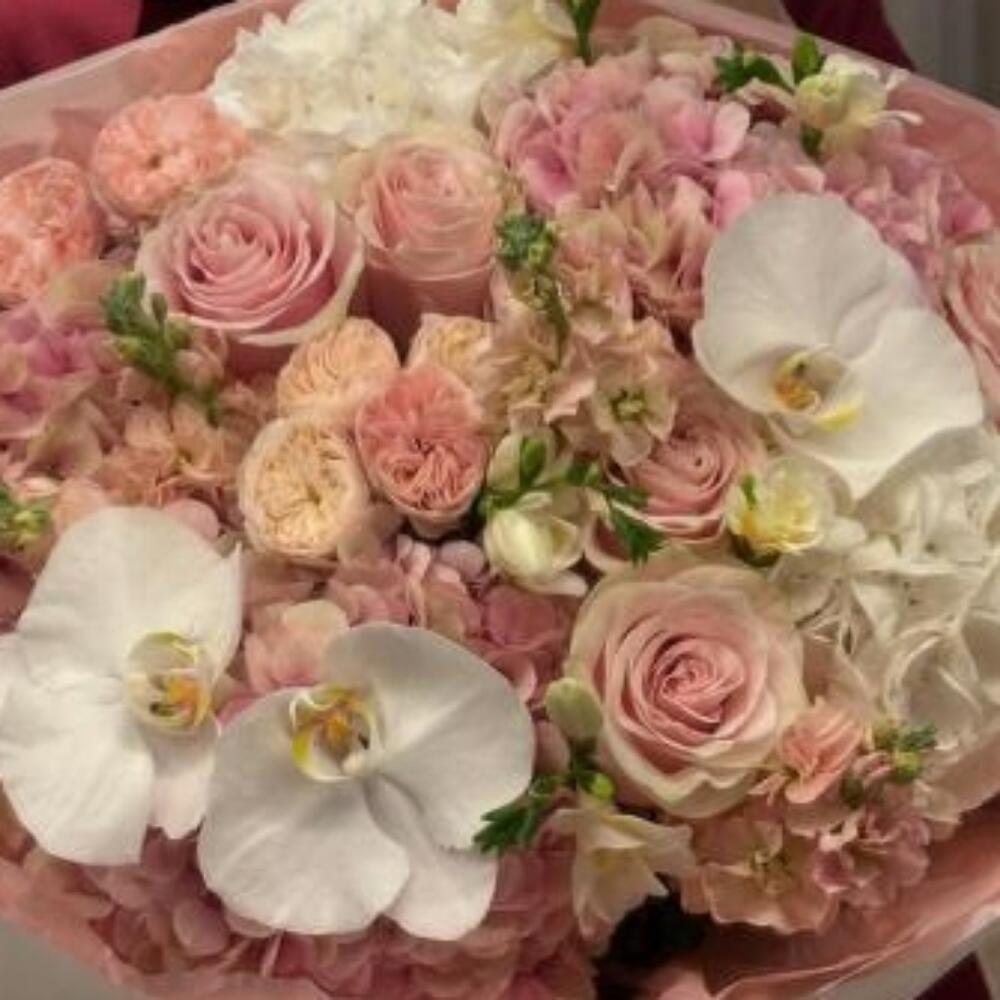 Романтическое сочетание нежных розовых оттенков, кремово-белых орхидей и сезонных пастельных цветов, вручную завязанных в фирменную упаковку Majd. Идеально подходит для дней рождения, свадеб, годовщин или просто для того, чтобы украсить чей-то день.