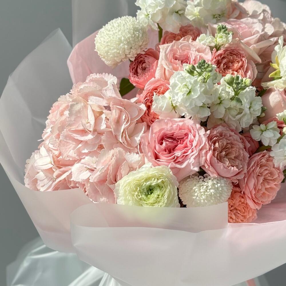 Hydrangea - 2 шт. chrysanthemum single - 3 шт. garden rose - 5 шт. mattiola - 3 шт. джульетта кустовая роза - 3 шт.