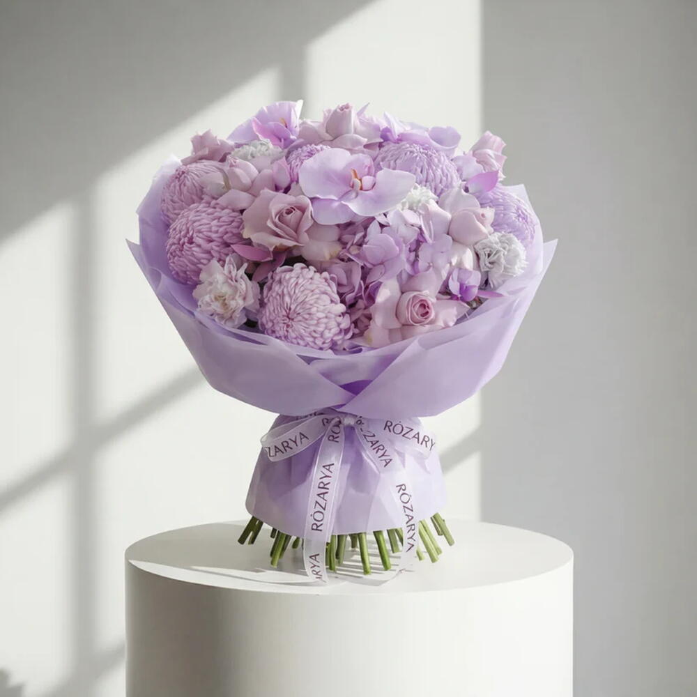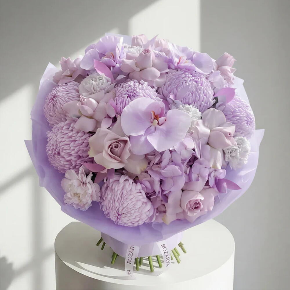 Мягкий монохромный букет в элегантных лавандовых оттенках, составленный из гортензии, роз, хризантем, цветков орхидеи и нежных гвоздик. Стильный, мечтательный и изысканный, этот букет — прекрасный выбор для дней рождения, женских праздников и вдумчивого подарка. • Пожалуйста, обратите внимание: поскольку цветы — это натуральный продукт, фактические цвета могут незначительно отличаться от цифровых изображений из‑за сезонного роста и условий освещения. Мы гарантируем, что общий стиль, премиальное качество, а также свежесть вашей композиции всегда будут сохранены.