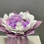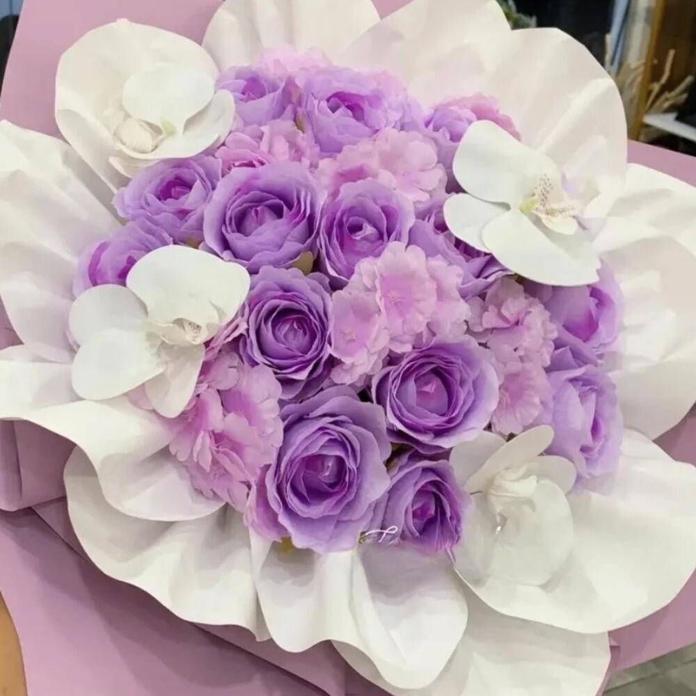 В композиции представлены светло-фиолетовые розы и белые орхидеи, завернутые в лавандовую и белую бумагу. Мыльные цветы — это искусственные цветы, сделанные из мыла, которые могут сохраняться длительное время, часто годами, если их держать вдали от прямых солнечных лучей и влаги. Их часто используют как долговечную альтернативу свежим цветам для подарков и домашнего декора. Букеты с мыльными розами и орхидеями доступны для различных случаев, включая дни рождения, годовщины и День святого Валентина. Такой тип букета сочетает нежный вид орхидей, которые символизируют любовь и элегантность, с фиолетовыми розами, которые могут означать глубокое восхищение и душевную связь. Стиль упаковки, часто называемый корейской упаковкой, использует несколько слоев бумаги, чтобы создать пышный, объёмный вид.