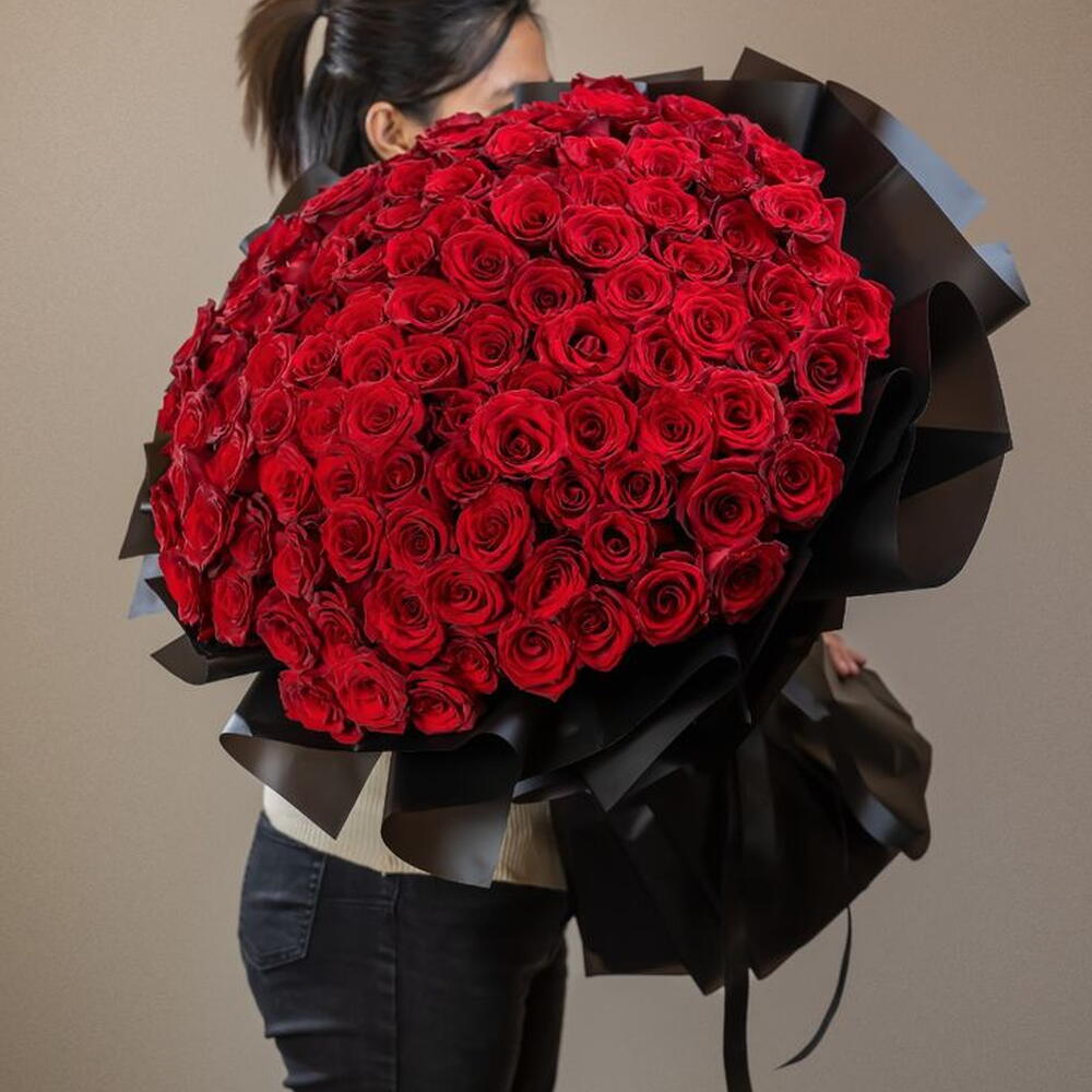 101 красная роза букет выглядит красиво, ручная работа, чёрная упаковка.
