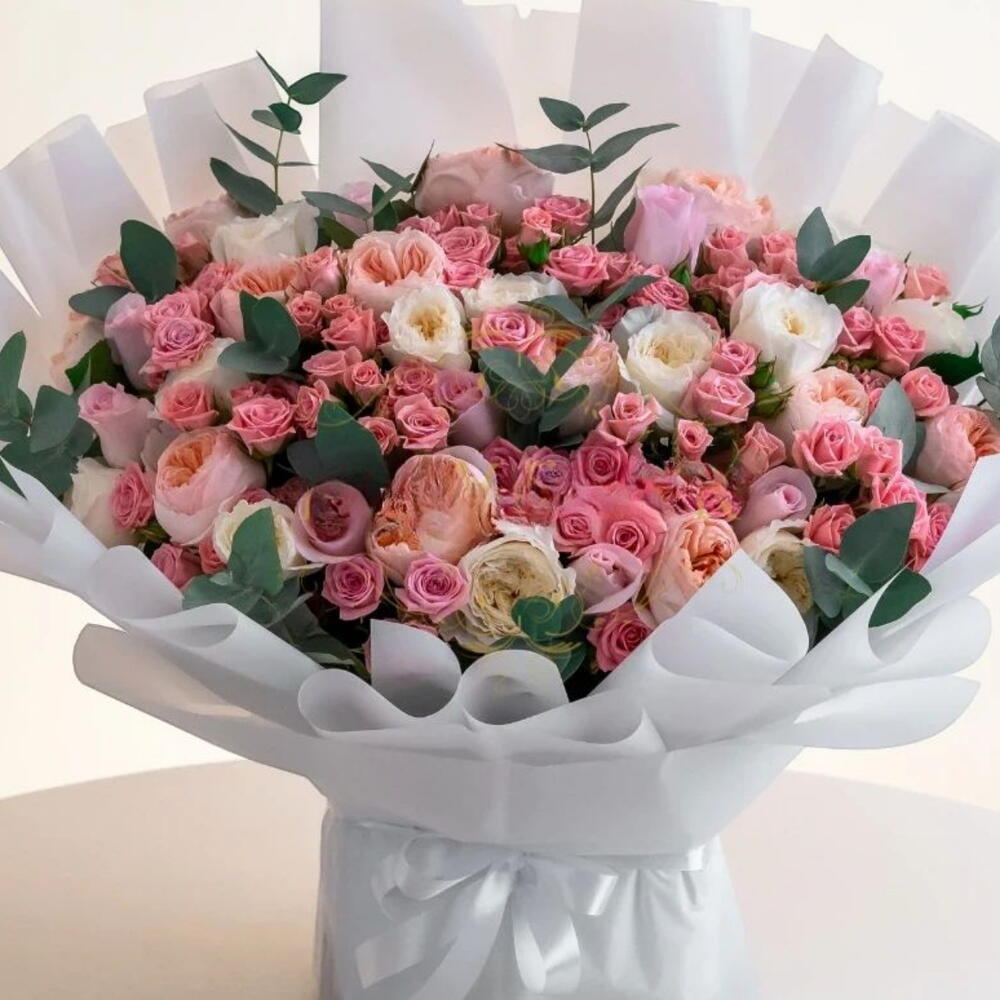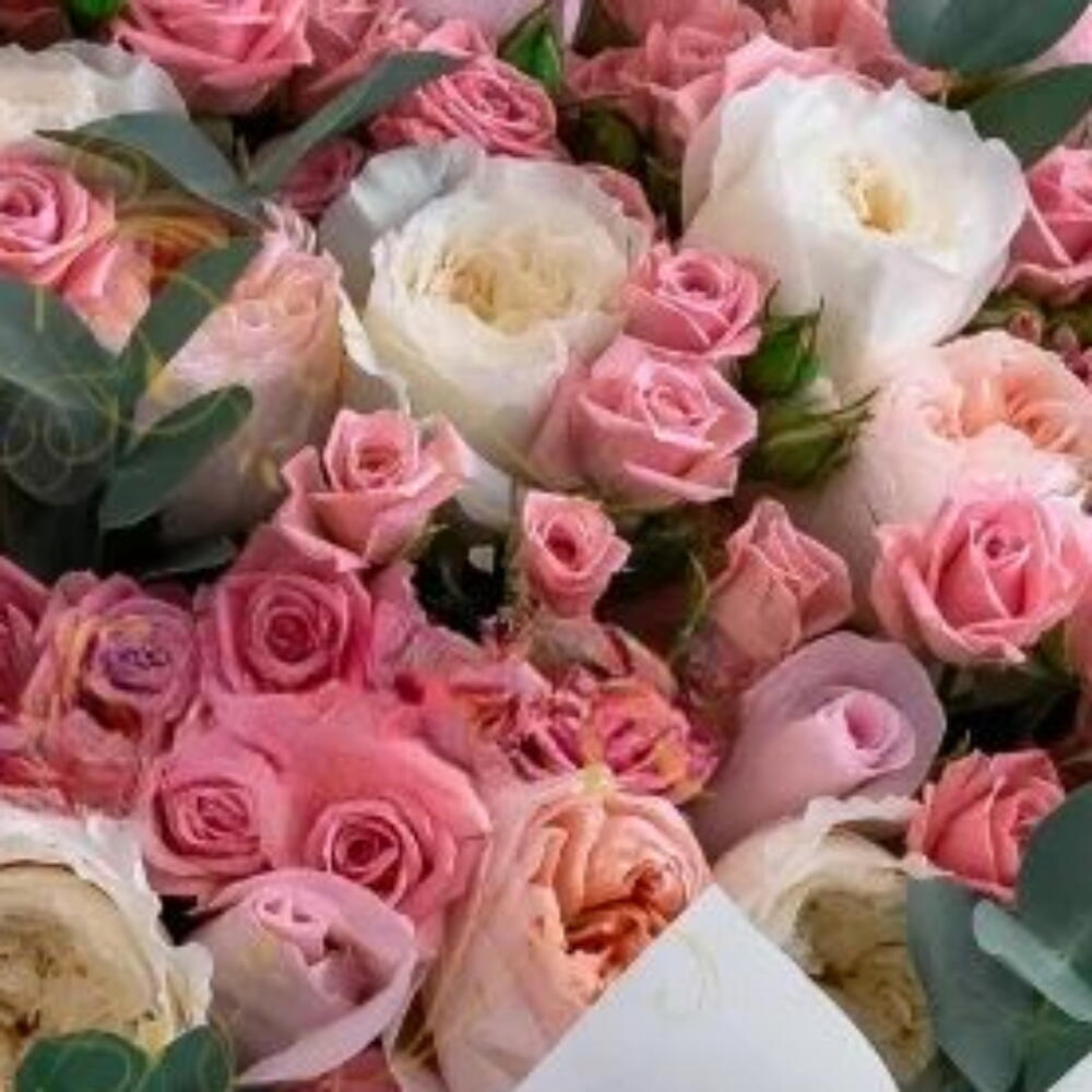 eucalyptus leaves - 10 шт. розовые спрей-розы - 51 шт. белые розы О'Хара - 10 шт. мягкие розовые розы - 8 шт. персиковые розы охара - 10 шт.