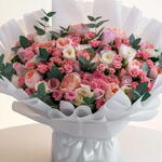 Это большой букет, связанный вручную, в котором сочетаются розы розового, персикового и белого оттенков, включая как стандартные, так и спрей-розы. Цветы плотно собраны вместе и дополнены зеленью, возможно листьями эвкалипта. Букет обернут в белую бумагу, которая сложена веерообразно вокруг цветов и закреплена у основания белой лентой, завязанной бантом.