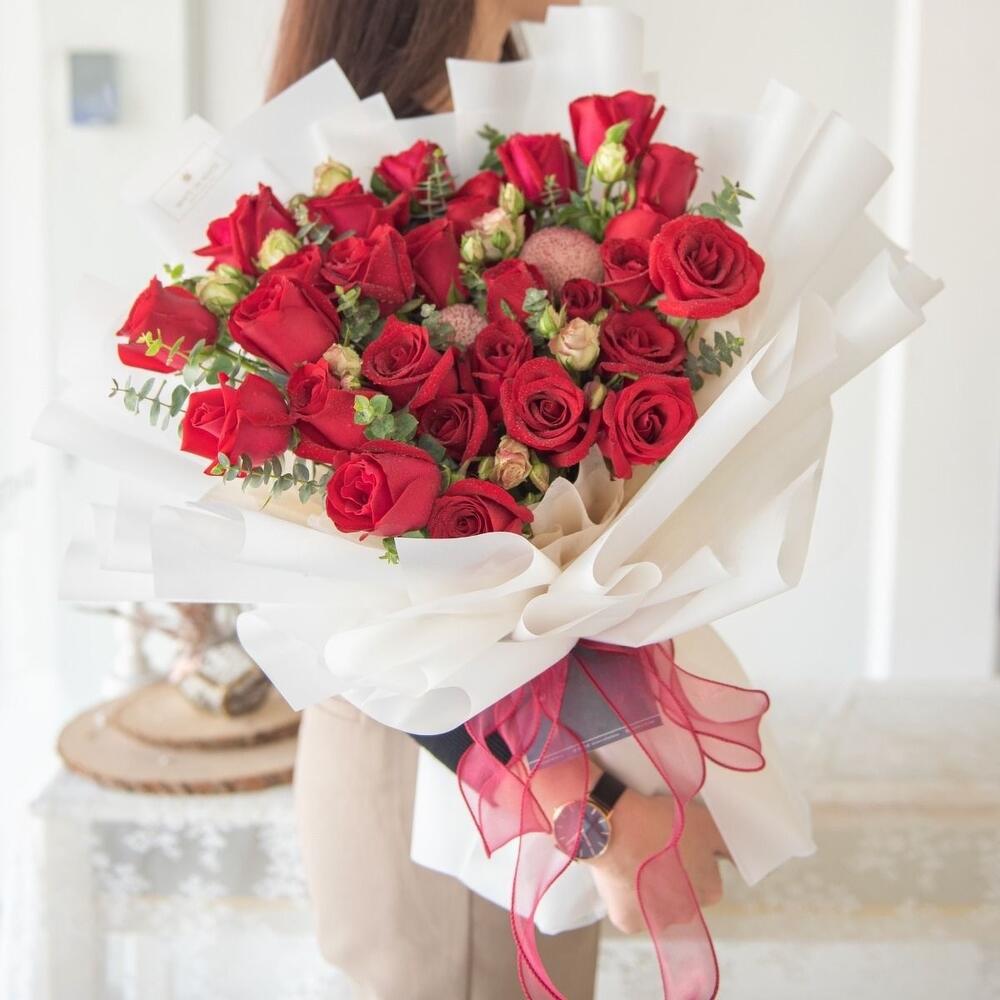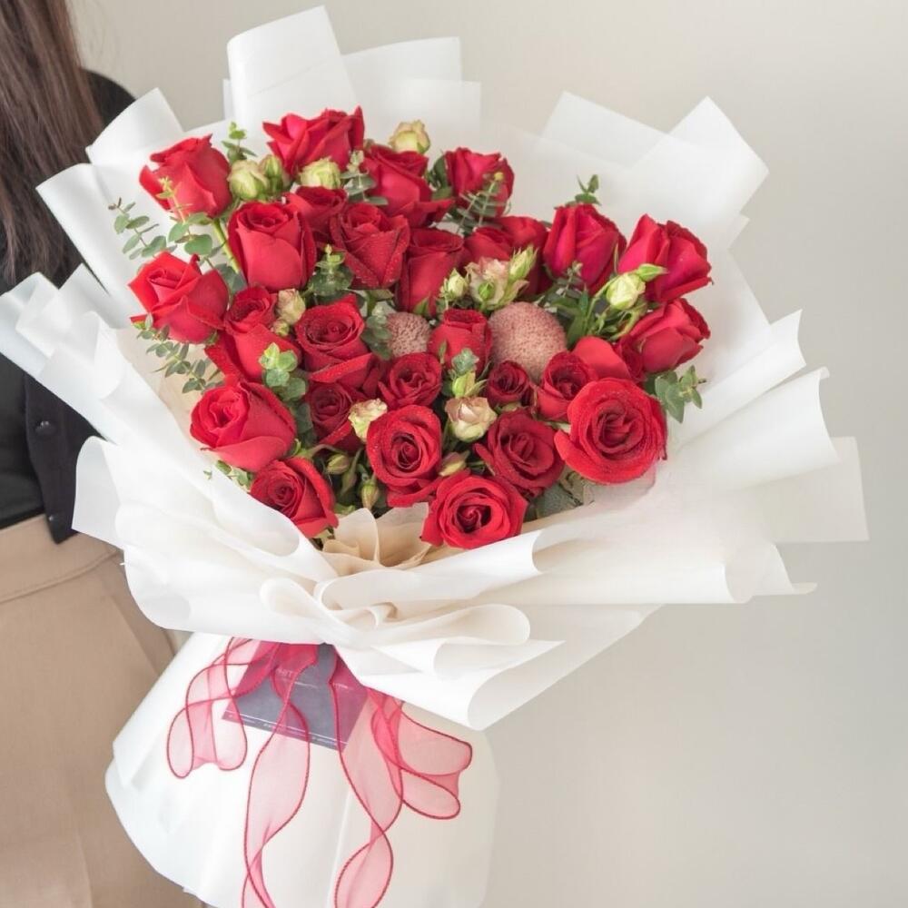Погрузитесь в красоту специальной подборки наших флористов – пленительной композиции, сочетающей в себе страсть 15 красных роз с очаровательным очарованием 15 кустовых роз. Ансамбль дополняет изысканный акцент из 4 румяных кустовых роз, создающих мягкий контраст. Эта очаровательная коллекция подчеркнута нежной текстурой 3 стручков скабиозы, добавляющих немного деревенского очарования, а 6 листьев эвкалипта придают освежающую зелень. Каждый элемент играет свою роль, складываясь в симфонию цветов и текстур, которая обязательно оставит неизгладимое впечатление. Идеально подходит как для трогательных жестов, так и для громких заявлений.