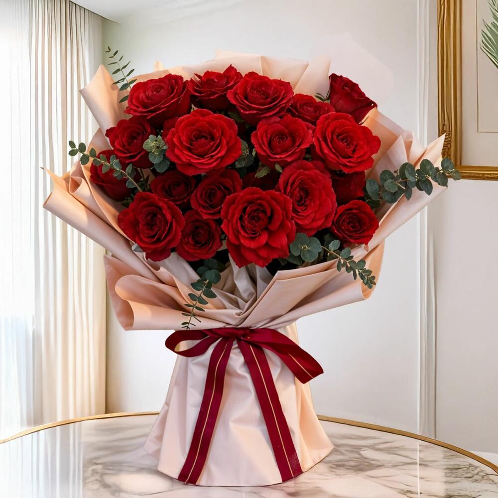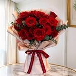 Потрясающий букет из 20 ярких красных роз, красиво оформленный свежими наполнителями. Символизируя глубокую любовь и преданность, этот элегантный букет — идеальный выбор для годовщин, романтических сюрпризов или особых торжеств.