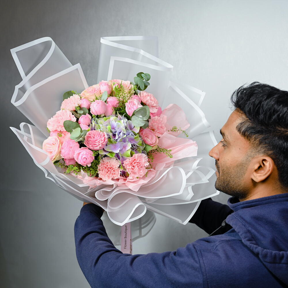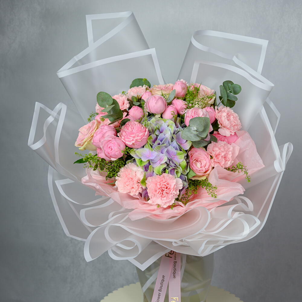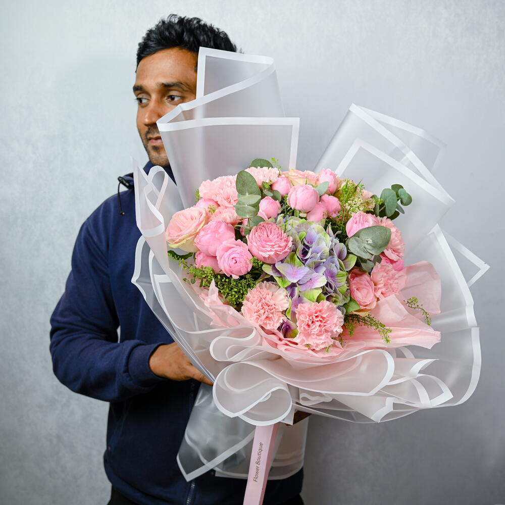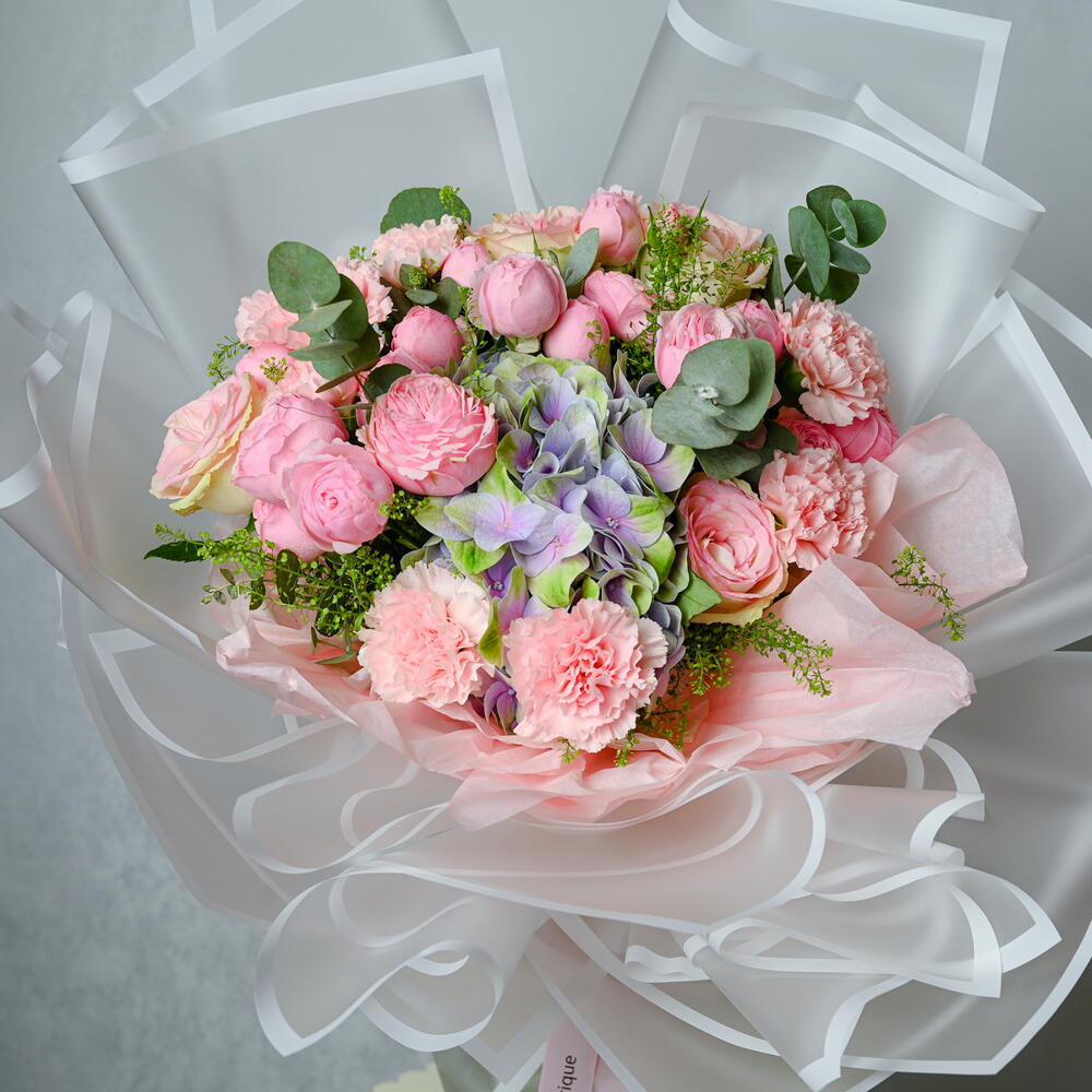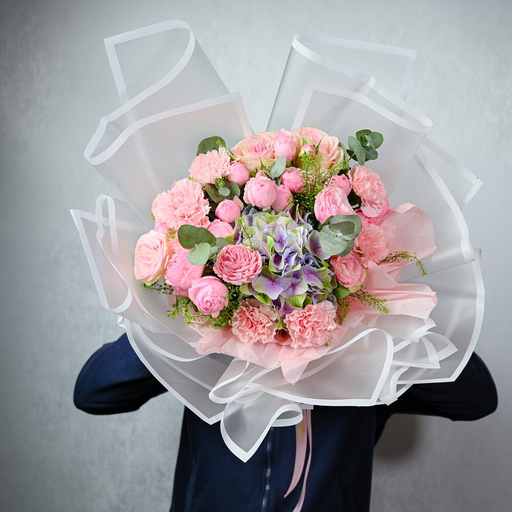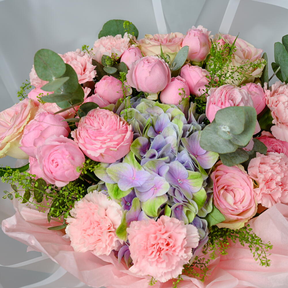 carnation pink - 6 шт. wrapping paper - 6 шт. липидиум - 2 шт. hydrengea - 1 шт. pink roses - 5 шт. кустовая роза Mansfield Park - 7 шт.