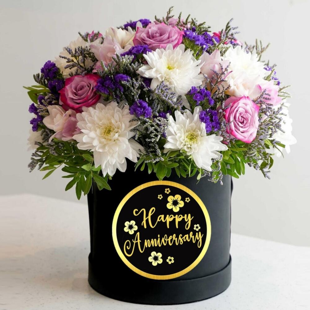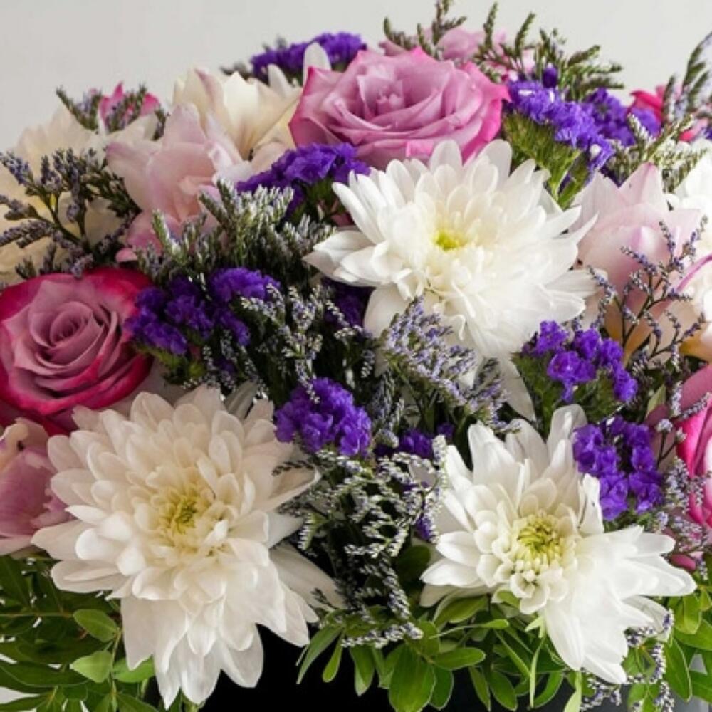rose - 7 шт. chrysanthemums bacardi white - 3 шт. наполнители - 3 шт. шляпная коробка - 1 шт.