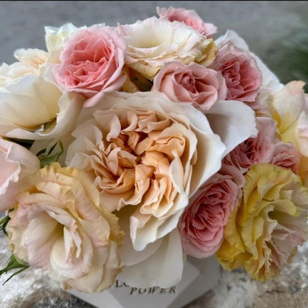 Eustoma - 5 шт. Spray rose - 8 шт. Box - 1 шт. Oasis - 1 шт. garden rose - 12 шт.