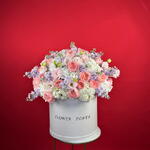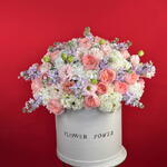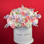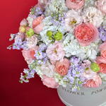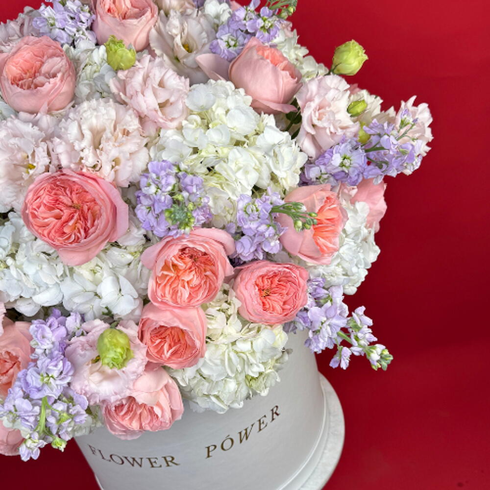 Box - 1 шт. гортензии белые - 27 шт. маттиола фиолетовая - 20 шт. светло-розовая эустома - 20 шт. роза diweina - 19 шт.
