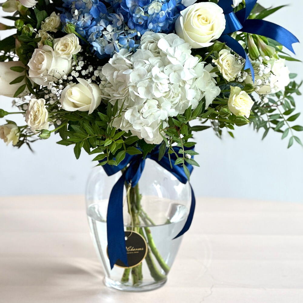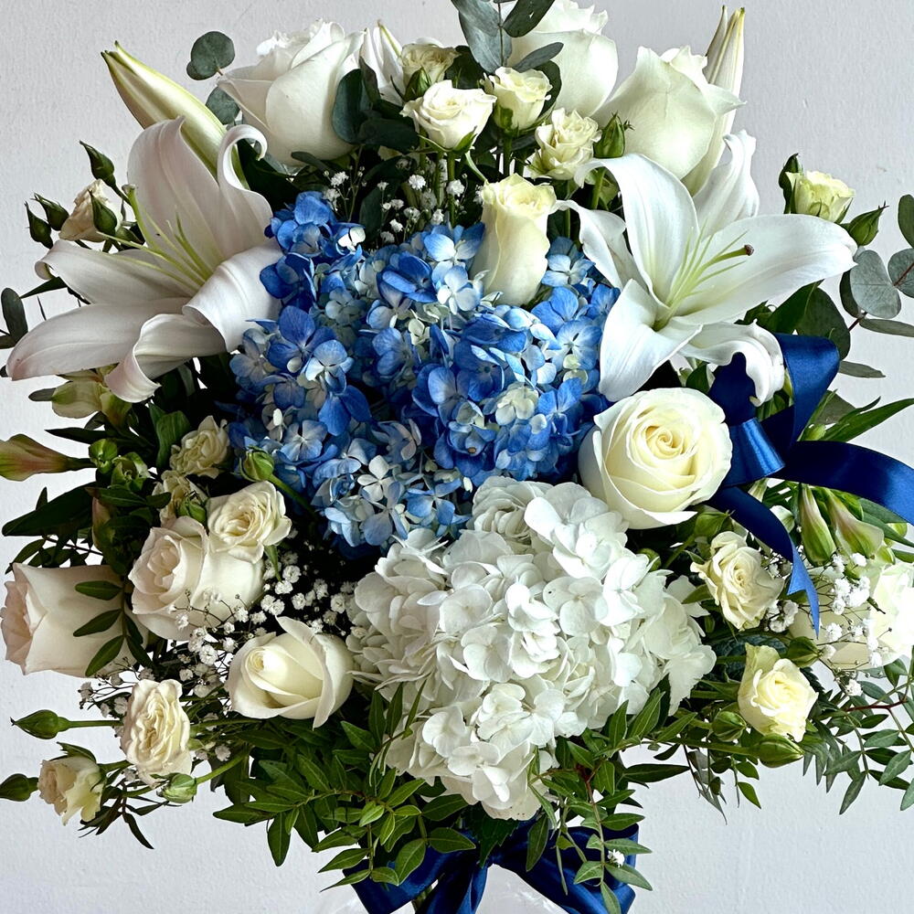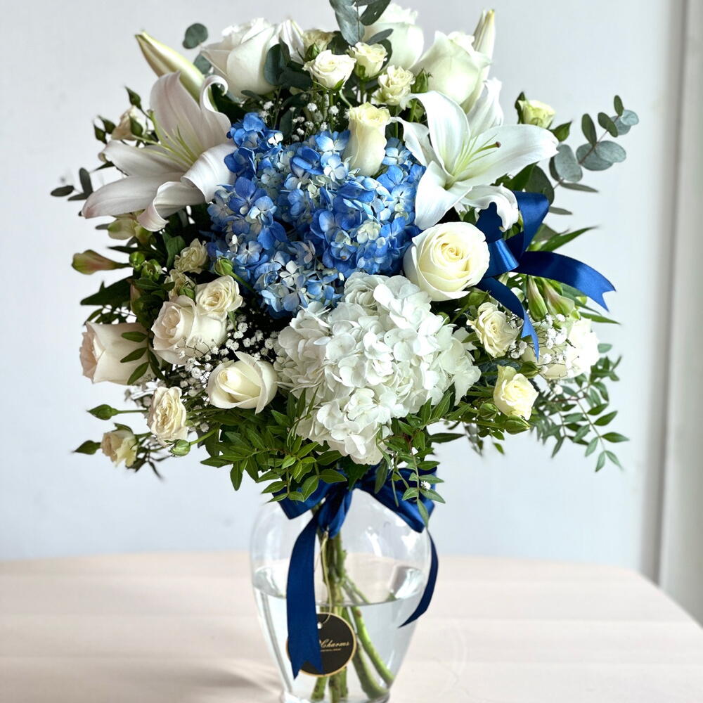Изысканная симфония элегантности и изящества — эта потрясающая композиция в вазе состоит из одной белой и одной синей гортензии, трёх белых лилий, десяти свежих белых роз и трёх белых альстромерий, которые прекрасно дополняются изысканными сезонными наполнителями. Идеально сбалансированная по цвету и форме, эта композиция излучает изысканность, чистоту и очарование, что делает её идеальным подарком на день рождения, годовщину, поздравление или элегантный декор дома. Настоящий цветочный шедевр, воплощающий безмятежность и непреходящую красоту. ✨💐 Добавьте элегантности любому пространству — закажите вазу с сине-белой гортензией сегодня и получите доставку в Дубай в тот же день!