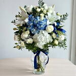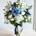 Eucalyptus - 5 шт. White rose - 10 шт. White lilies - 3 шт. Vase - 1 шт. white alstroemeria - 3 шт. blue hydrangea - 1 шт. white hydrangea - 1 шт. синяя лента - 1 шт.