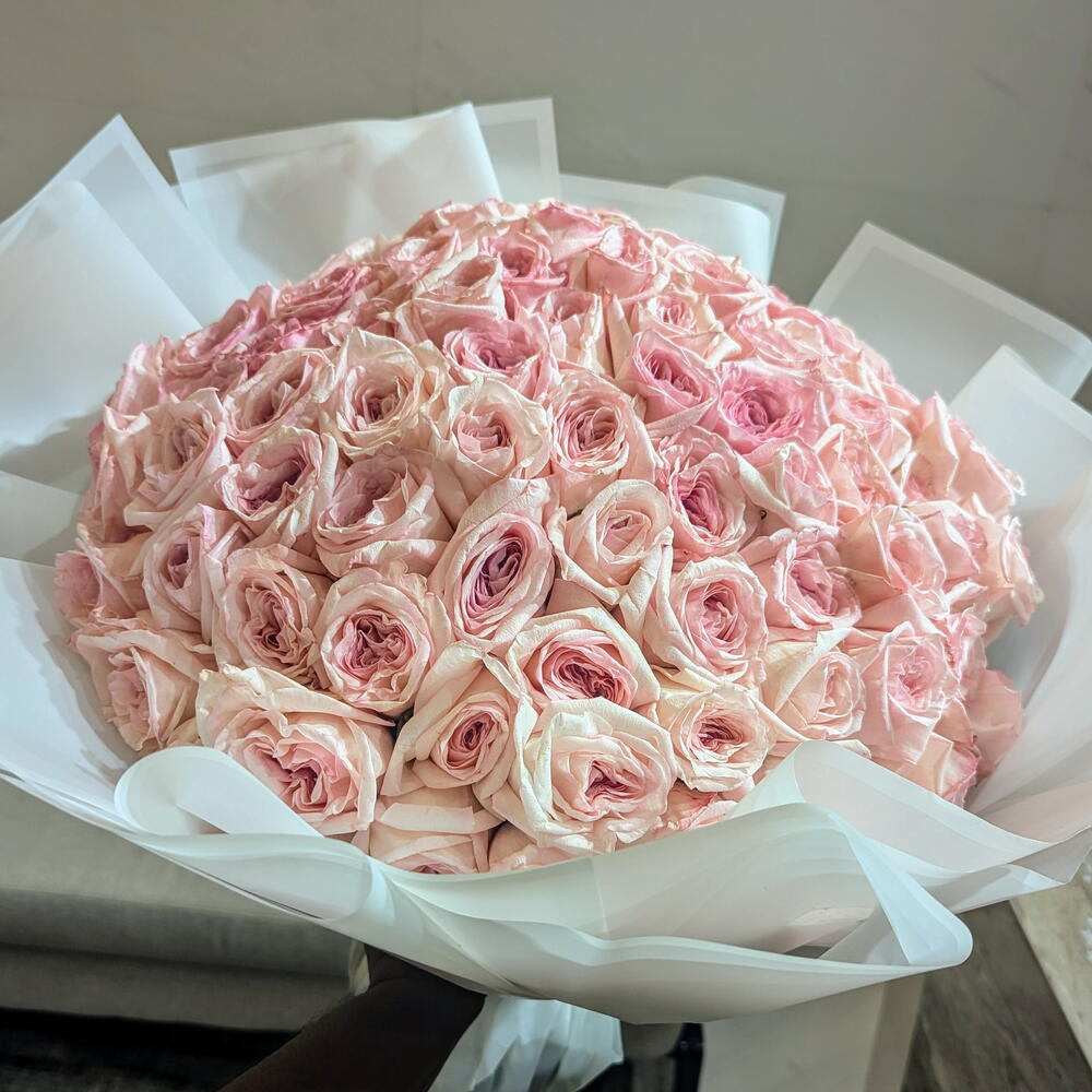 Потрясающий ручной букет из 100 ароматных роз OHara нежно-розового цвета, известных своими роскошными лепестками и завораживающим ароматом. Эта элегантная композиция сочетает мягкие романтические оттенки с сладким цветочным ароматом, создавая по-настоящему чарующее впечатление. Идеально подходит для особых случаев, он излучает грацию и красоту, оставляя неизгладимое впечатление своим вневременным обаянием и изысканным шармом.