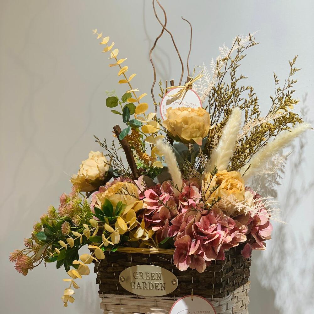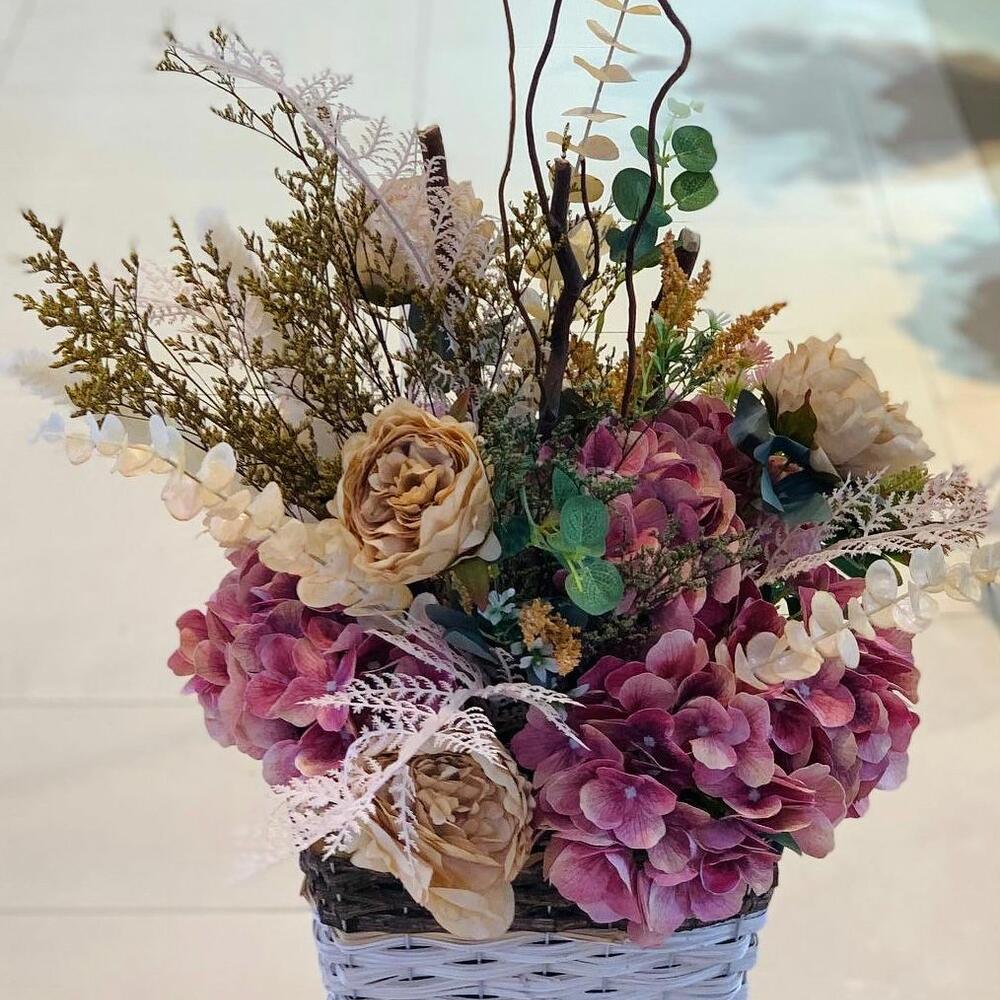 Basket - 1 шт. caspia - 2 шт. эукалей - 2 шт. гортензия - 3 шт. салик палка - 2 шт. пион роза - 5 шт.