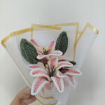 Ощутите очарование цветов, которые цветут вечно. Этот изысканный букет, полностью выполненный вручную крючком (100%), включает детально проработанные розовые тигровые лилии и пышную зелень. В отличие от живых цветов, этот арт-букет служит постоянным элементом домашнего декора и постоянным напоминанием о особом моменте. Почему выбрать этот букет? Вечная красота: Эти лилии никогда не завянут и не высохнут, что делает их идеальным долгосрочным сувениром. Ремесленное мастерство: Каждый лепесток и листик тщательно связан вручную из высококачественной мягкой пряжи с хлопком. Гипоаллергенно: Идеально подходит для близких с аллергией на пыльцу или для больничных учреждений, где живые цветы могут быть запрещены. Готово к вручению: Элегантно упаковано в премиальную белую флористическую бумагу с золотой каймой, завершено классическим белым атласным бантом. Идеально для: Годовщины и дни рождения: Символичный подарок вечной любви. Выпускные: Прочный букет, выдерживающий долгую церемонию и фотосессии. Декор для дома: Добавляет мягкую, уютную и деревенскую эстетику в любую комнату