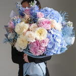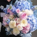 Statice - 20 шт. Pink rose - 10 шт. White rose - 10 шт. carnation - 10 шт. blue hydrangea - 2 шт. garden rose - 10 шт. delphinium - 5 шт. pink hydrangea - 2 шт.
