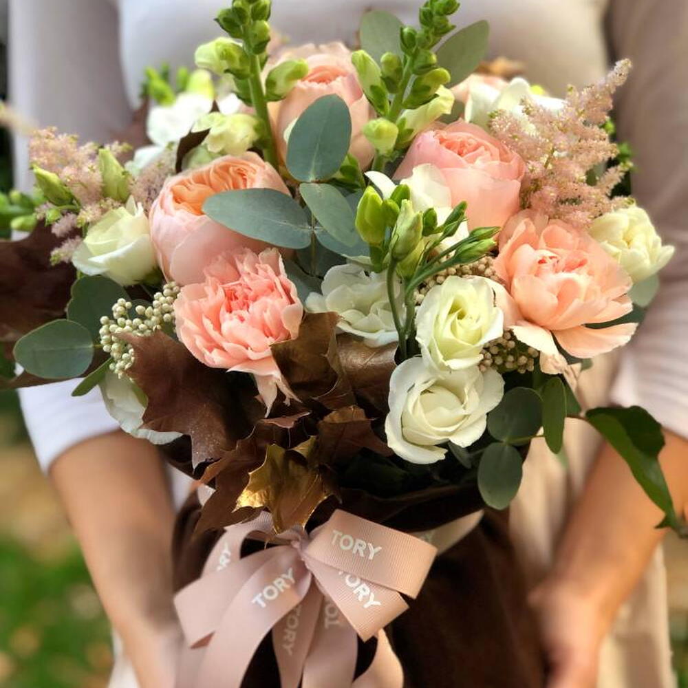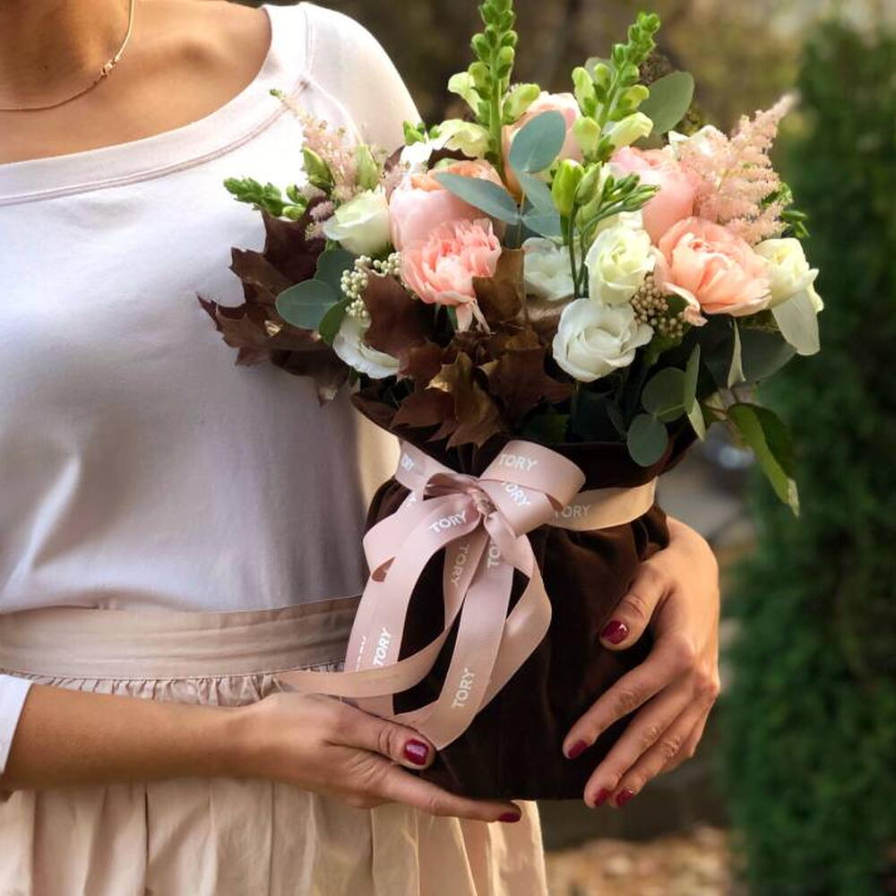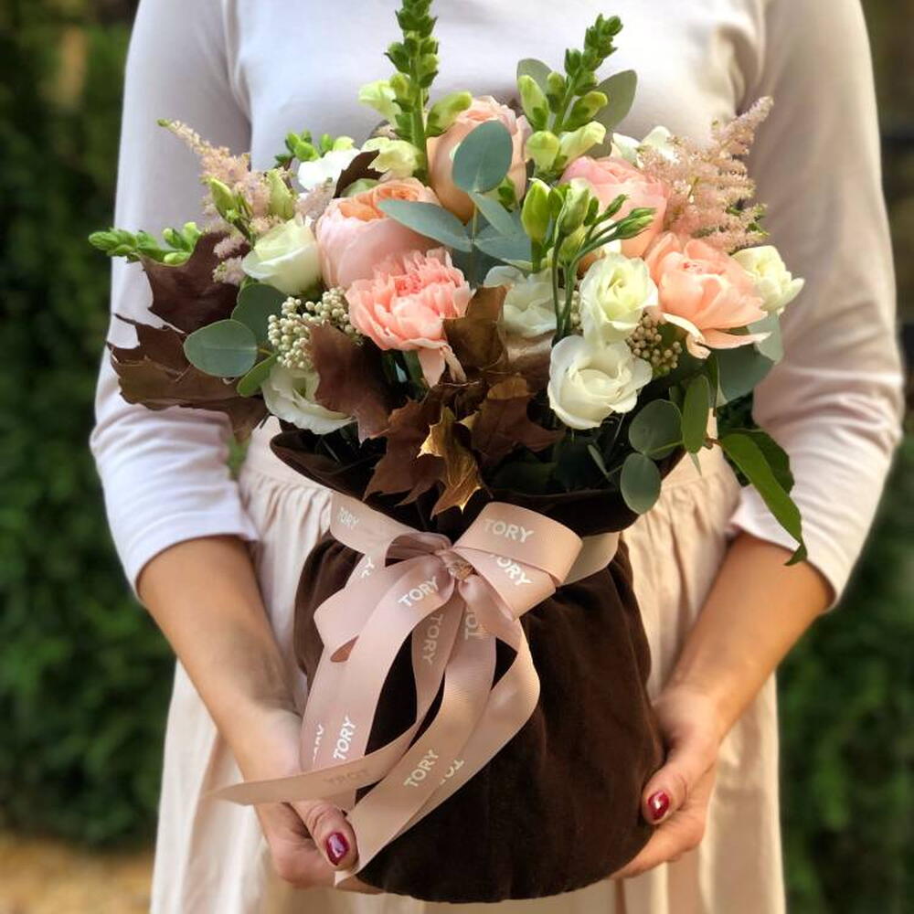 Composition: Rose David Austin - 3, Freesia - 3, Lisianthus - 2, Astilbe - 3, Eucalyptus - 1, Ozothamnus - 1, Antirrinum (Snapdragon) - 3, Quercus - 2, Dianthus - 3, velvet bag - 1, ribbon - 1 Sizes: WIDTH - 25CM; HEIGHT - 30CM; LENGTH - 30CM; (including packaging) Размер: 25 x 30 x 30 см